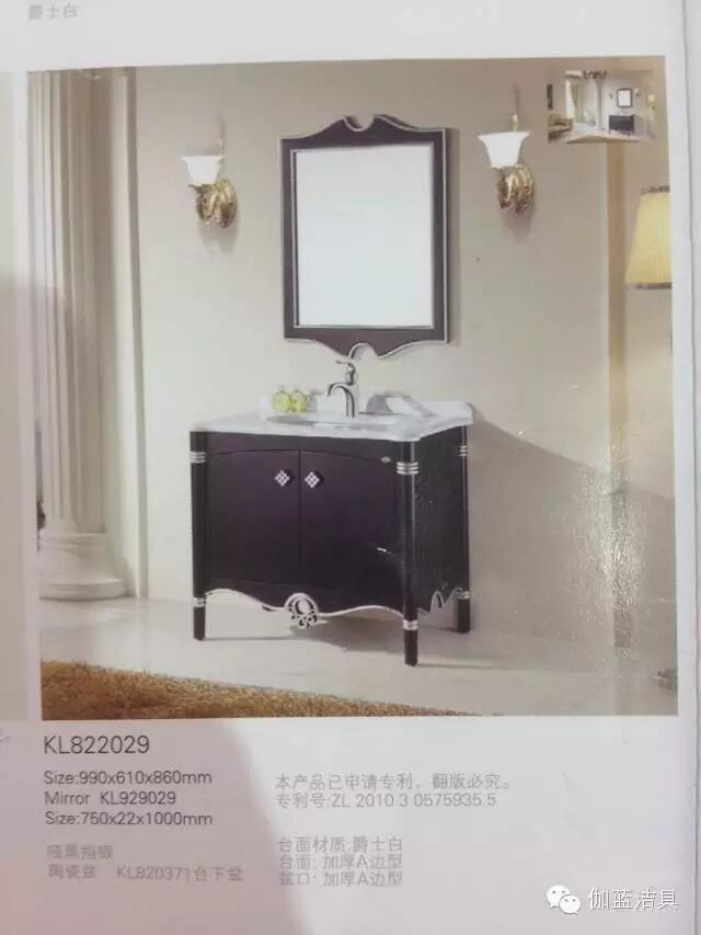 2011年,心海伽蓝自主研发的KL822029浴室柜推出市场,其专利号为ZL201030575935.5,该款产品的主色调采用哑黑描银,款式风格将古典与现代的相融合,一推出市场就受到消费者热捧,产品也同时成为行业竞相模仿抄袭的对象。