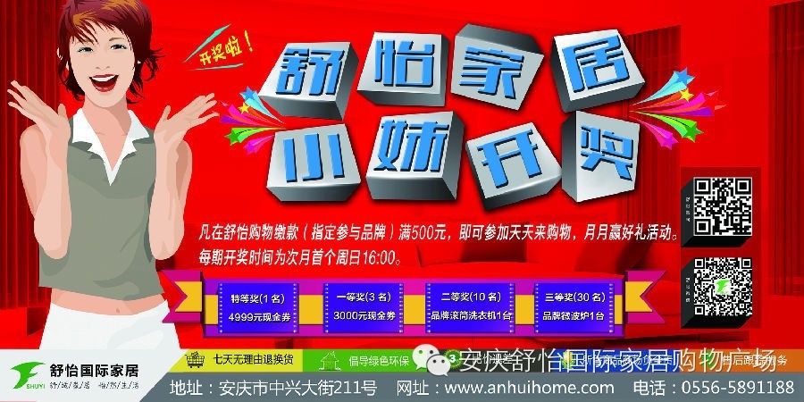 凡在安庆舒怡购物达500元,即可参加每月小妹开奖活动,轻松赢取现金礼、家电礼。百家知名品牌,联袂倾情奉献,每月首个周日,来安庆舒怡看小妹开奖吧!安庆舒怡国际家居免费接送热线:0556—5891188 5891688